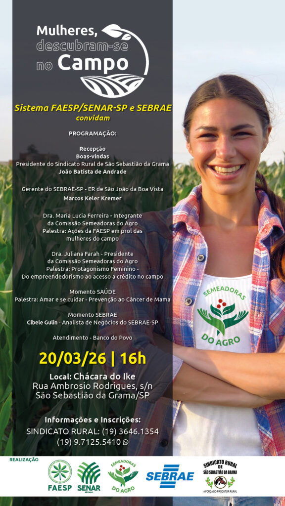 A iniciativa “Mulheres, Descubram-se no Campo” da Comissão Semeadoras do Agro, da Federação da Agricultura e Pecuária do Estado de São Paulo (Faesp), em parceria com o Sebrae-SP, chega a mais um município paulista nesta sexta-feira (20/03). Desta vez, São Sebastião da Grama receberá o projeto que leva a produtoras rurais empoderamento, estímulo ao empreendedorismo e troca de experiências.