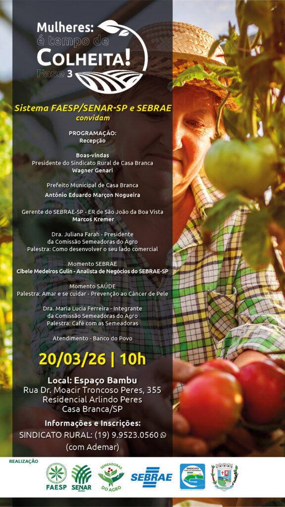 Em mais uma importante ação, o programa “Mulheres: É Tempo de Colheita!” chega na sexta-feira (20/03), à cidade de Casa Branca. A iniciativa é da Comissão Semeadoras do Agro, da Federação da Agricultura e Pecuária do Estado de São Paulo (Faesp), em parceria com o Sebrae DELAS, Sindicatos Rurais, prefeituras e entidades locais, e encerra o ciclo de capacitação e fomento a novas lideranças femininas no agro paulista.