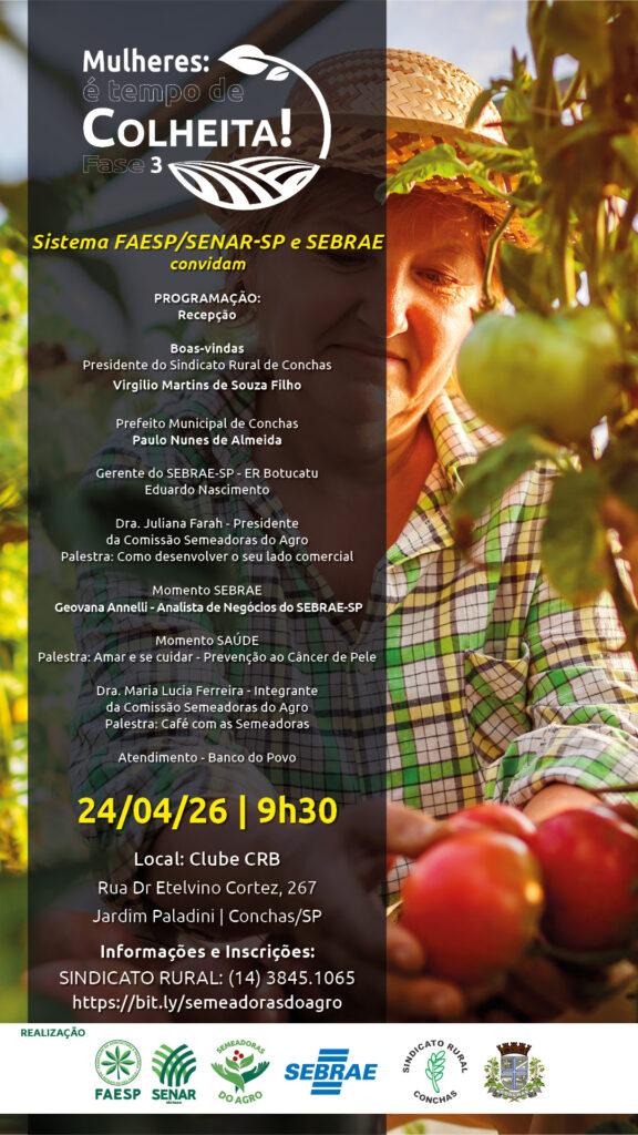 Em mais uma importante ação, o programa “Mulheres: É Tempo de Colheita!” chega na sexta-feira (24/04), à cidade de Conchas. A iniciativa é da Comissão Semeadoras do Agro, da Federação da Agricultura e Pecuária do Estado de São Paulo (Faesp), em parceria com o Sebrae DELAS, Sindicatos Rurais, prefeituras e entidades locais, e encerra o ciclo de capacitação e fomento a novas lideranças femininas no agro paulista.