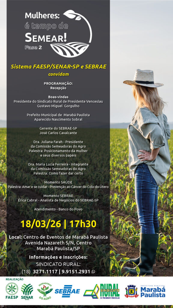 A Federação da Agricultura e Pecuária do Estado de São Paulo (Faesp), em parceria com o Sebrae-SP, tem o prazer de anunciar a chegada do projeto “Mulheres: É Tempo de Semear!” a Marabá Paulista. O evento ocorrerá na quarta-feira (18/03), às 17h30, no Centro de Eventos Espaço de Marabá Paulista, avenida Nazareth, s/n, Centro.