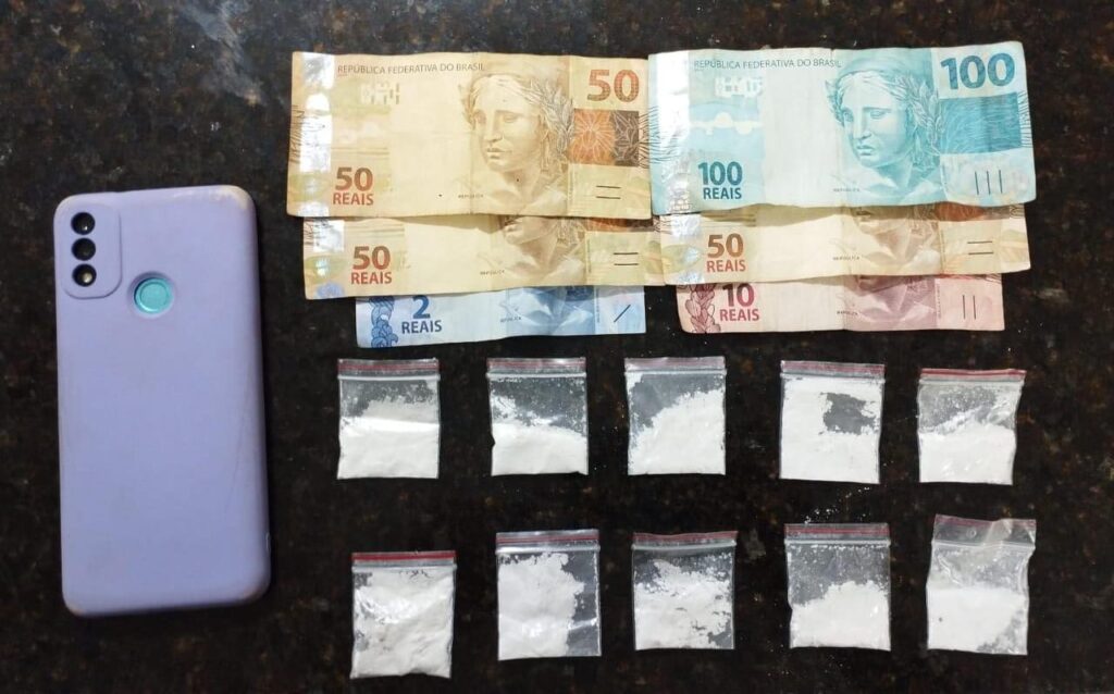 Durante a revista pessoal, foram encontrados, dentro de sua pochete, dez papelotes aparentando cocaína, a quantia de R$ 262,00 em espécie e um aparelho telefone celular. Diante das circunstâncias, foi necessário o uso de algemas, conforme preconiza a Súmula Vinculante nº 11, por receio de fuga e integridade física da equipe.