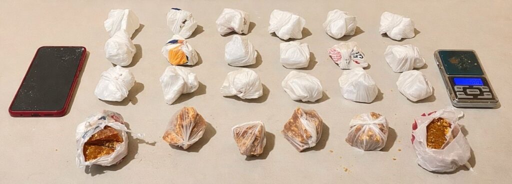 O suspeito foi detido e algemado devido sua reação ao ser abordado. Na sacola dispensada havia doze porções análogas à cocaína em pedras brutas, oito rochas de crack, uma balança com resquícios de crack e dois aparelhos celulares.