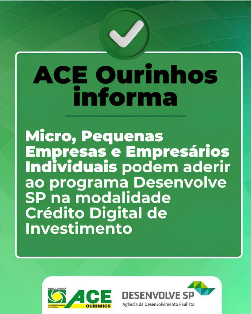 Democratizar o crédito sustentável, gerando renda, emprego e desenvolvimento econômico. Com esse objetivo, a agência de fomento do Governo do Estado, a Desenvolve SP, lançou uma série de programas de crédito e a ACE Ourinhos está apoiando os associados que queiram fazer a adesão.