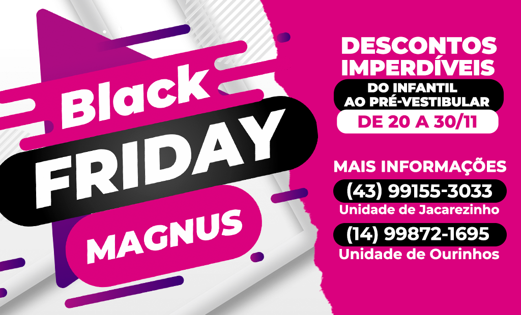 Não perca a oportunidade de investir no futuro acadêmico de seu filho com descontos irresistíveis durante a Black Friday Magnus. Você que quer o melhor futuro para o seu filho, venha para o Magnus e não perca essa oportunidade. Garanta uma educação de qualidade com preços especiais e faça parte desta celebração única de aprendizado e crescimento.