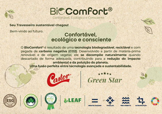 Além do uso da tecnologia Biovisco™ da LEAF, a capa do travesseiro BioComfort® é feita de tecido orgânico, reforçando o compromisso da Castor com a sustentabilidade. O produto é 100% reciclável, promovendo um ciclo de vida mais sustentável. A pegada de carbono do travesseiro BioComfort® é de 1,70 Kg CO2 Eq/Kg, em comparação com os 5,0 Kg CO2 Eq/Kg de um travesseiro convencional.