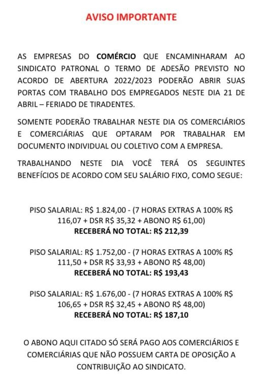 Veja a seguir comunicado na íntegra emitido pelo sindicato e os valores que têm direito a receber os funcionários que trabalharem no feriado: