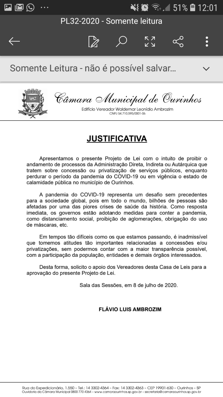 O edil, que participou da Audiência Pública virtual, realizada no dia 1º de Julho, onde foram apresentadas as minutas do edital e do contrato da futura concessão para exploração do serviço público municipal de esgotamento sanitário da cidade, hoje realizado pela Superintendência de Água e Esgoto de Ourinhos, justifica a ação devido aos tempos difíceis que estamos vivendo em decorrência da pandemia, e que não é o momento de se tomar uma decisão tão importante sem a devida transparência e a participação da população, entidades e demais órgãos interessados.