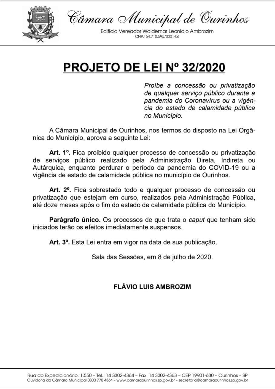 O Projeto, de autoria do Vereado Flávio Luiz Ambrozin, está na Pauta do dia da 24ª Sessão Ordinária, e tem como objetivo proibir o andamento de processos da Administração Direta, Indireta ou autárquica, que tratem sobre concessão ou privatização de serviços públicos, enquanto perdurar o período de pandemia do Covid-19 ou o estado de calamidade pública do município.