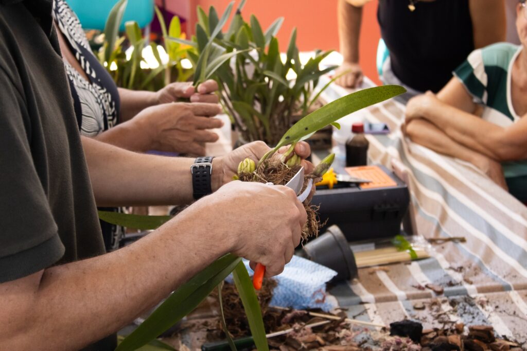 Durante os dois dias de atividades, os participantes tiveram acesso a conteúdos teóricos e práticos sobre cultivo de orquídeas, identificação de espécies, aplicação de adubos e defensivos, multiplicação, plantio e replante, tipos de vasos, suportes para orquídeas pendentes, controle de pragas, além da montagem de orquidário, montagem de bancadas e noções de comércio da planta.