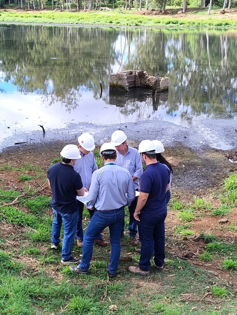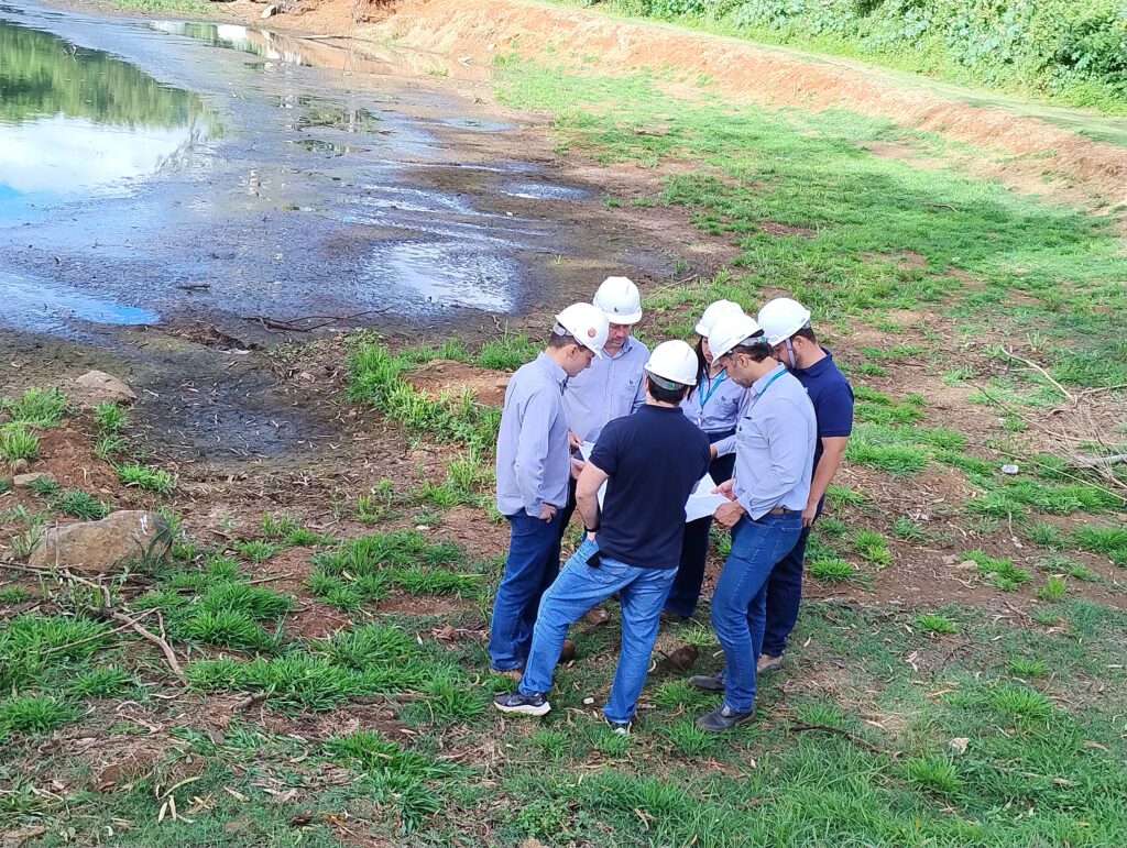 As equipes da Ourinhos Saneamento e da GS Soluções analisam cada detalhe do projeto, que prevê o desassoreamento e a impermeabilização da atual lagoa do rio Pardo com mantas especiais.
