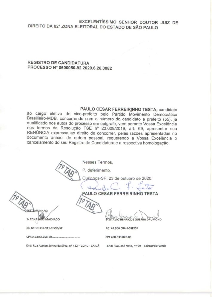 Dr. Ferreirinha apresentou nesta tarde, ao seu partido, MDB, uma carta onde renuncia ao cargo de vice candidato a prefeito na chapa ‘Melhor gestão faça parte desta evolução’, devido a uma suposta impugnação que poderia acontecer, por conta do médico, que é concursado, portanto servidor público, ter continuado seus atendimentos no posto de saúde da cidade, principalmente atuando junto aos casos de Covid-19.