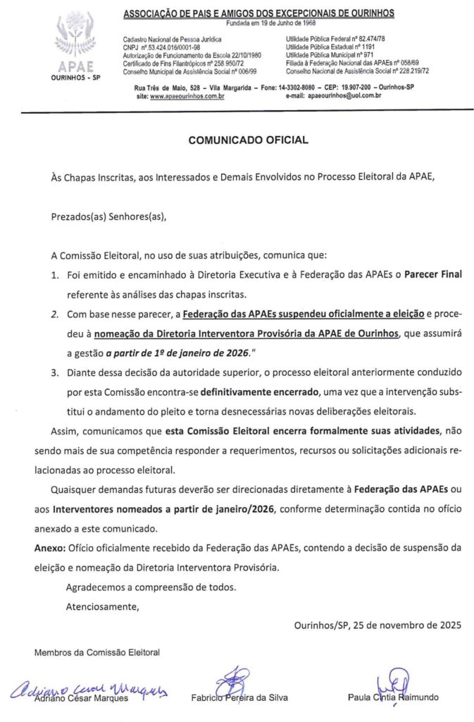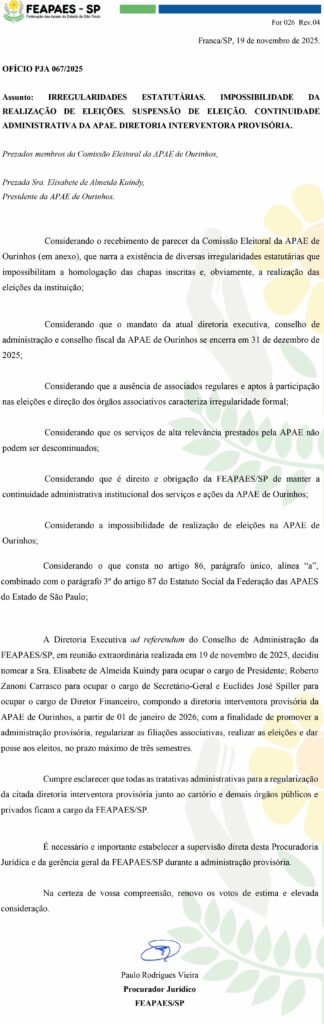“A FEAPAES/SP acompanhará diretamente essa etapa, garantindo que toda a reorganização seja feita com transparência e em conformidade com o estatuto. Temos certeza que ao final do processo a APAE de Ourinhos estará completamente regularizada para retomar o ciclo eleitoral de forma segura e dentro das normas”, declarou a federação.