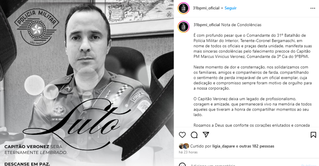 O capitão da Polícia Militar (PM) Marcus Vinícius Veronez, de 47 anos, ex- comandante do 31º Batalhão da Polícia Militar do Interior (BPMI) de Ourinhos, faleceu na madrugada deste domingo (19) em Marília/SP.