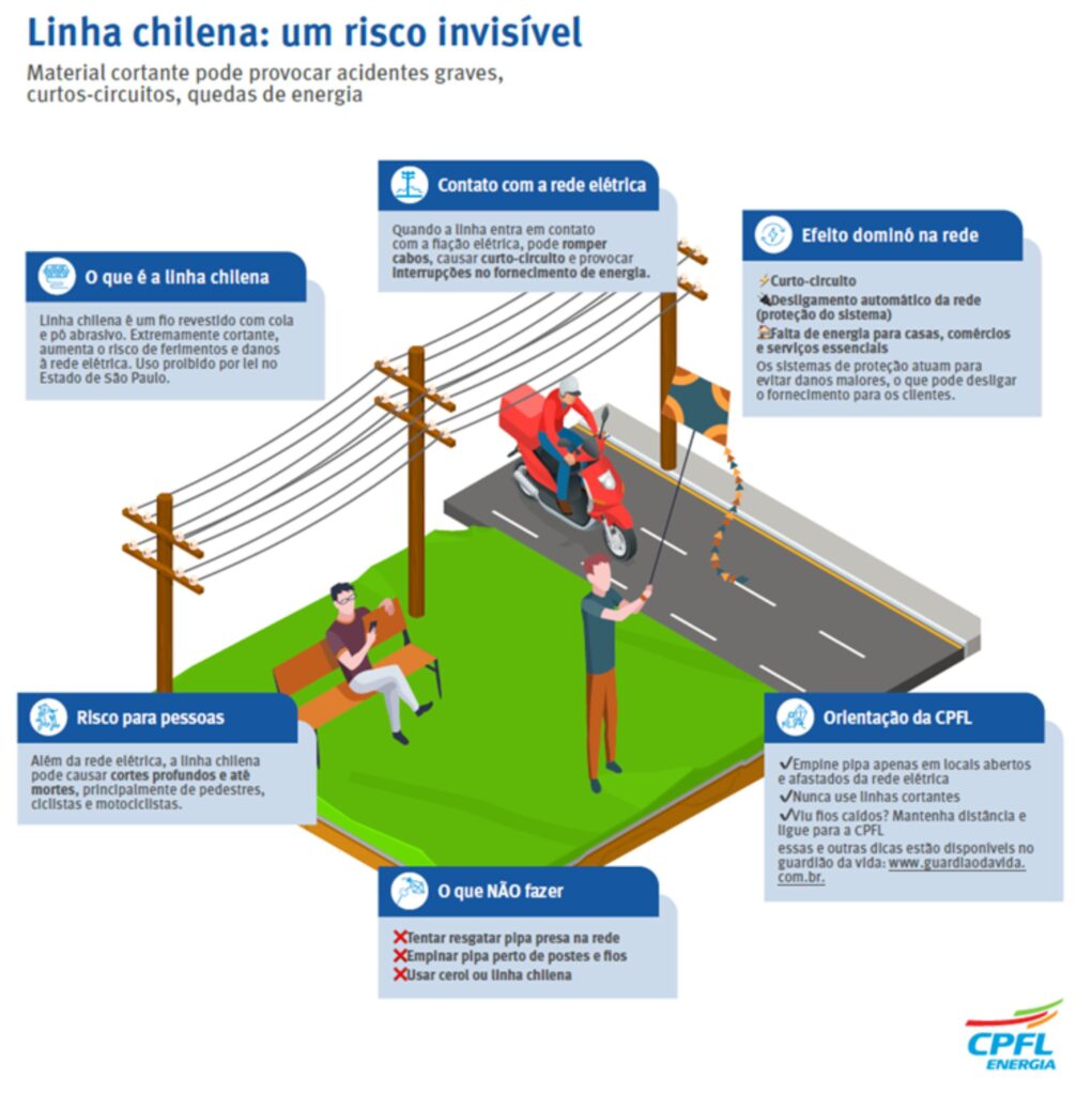 Com a chegada das férias escolares, aumenta o número de crianças e adolescentes em brincadeiras ao ar livre, como empinar pipa. Diante desse cenário, a CPFL Santa Cruz reforça o alerta sobre os riscos da prática quando realizada próxima à rede elétrica, situação que pode provocar acidentes graves, interrupções no fornecimento de energia e até mortes.
