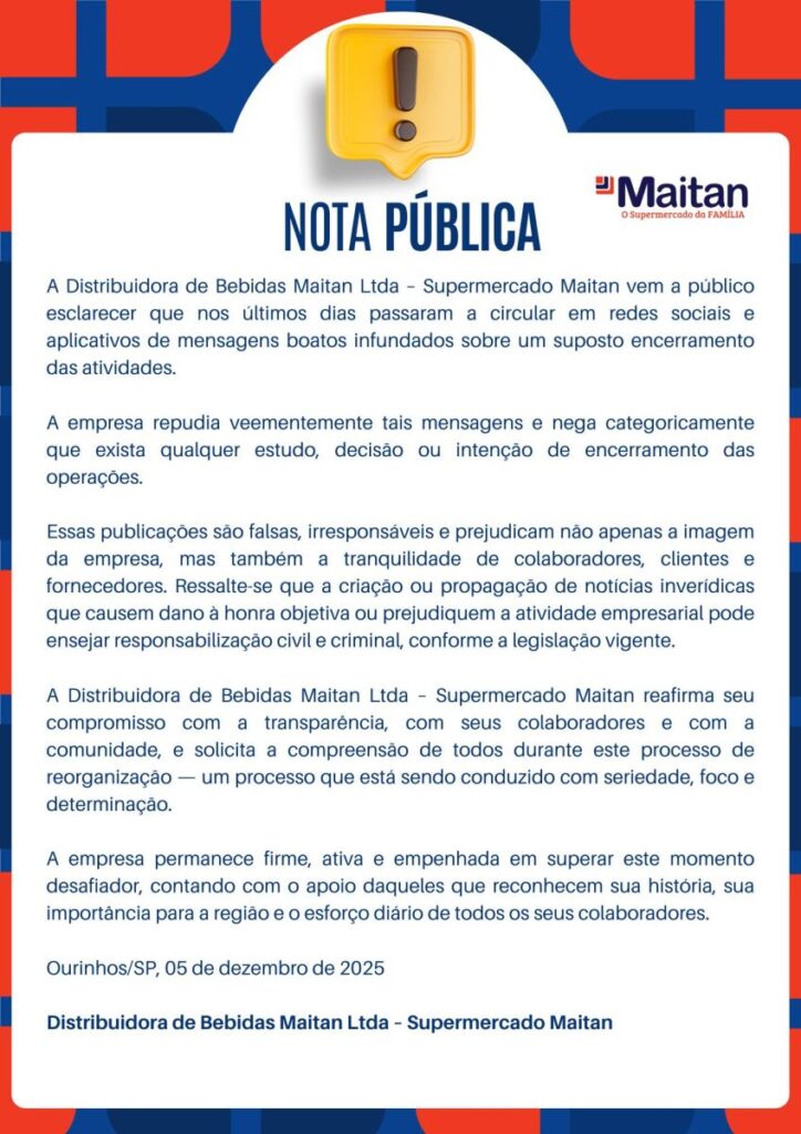 Funcionários da loja II do Supermercado Maitan, localizado na Avenida Domingos Camerlingo Caló, declararam greve na manhã desta segunda-feira, 29/12, devido ao atraso no pagamento dos salários e do 13º. A situação, que já se arrasta há vários dias, se tornou insustentável diante do silêncio dos responsáveis pelo mercado, forçando os colaboradores a paralisarem suas atividades.