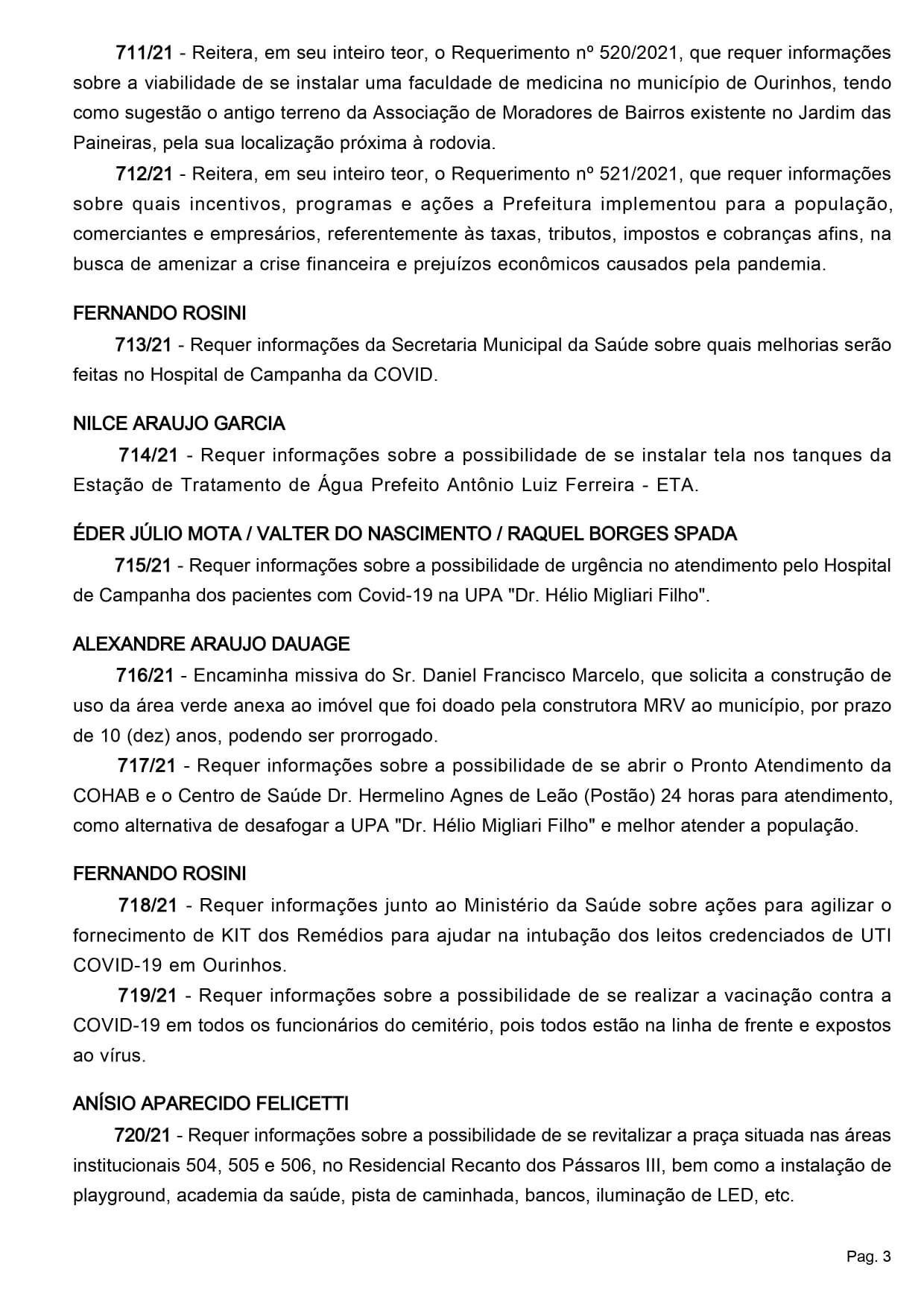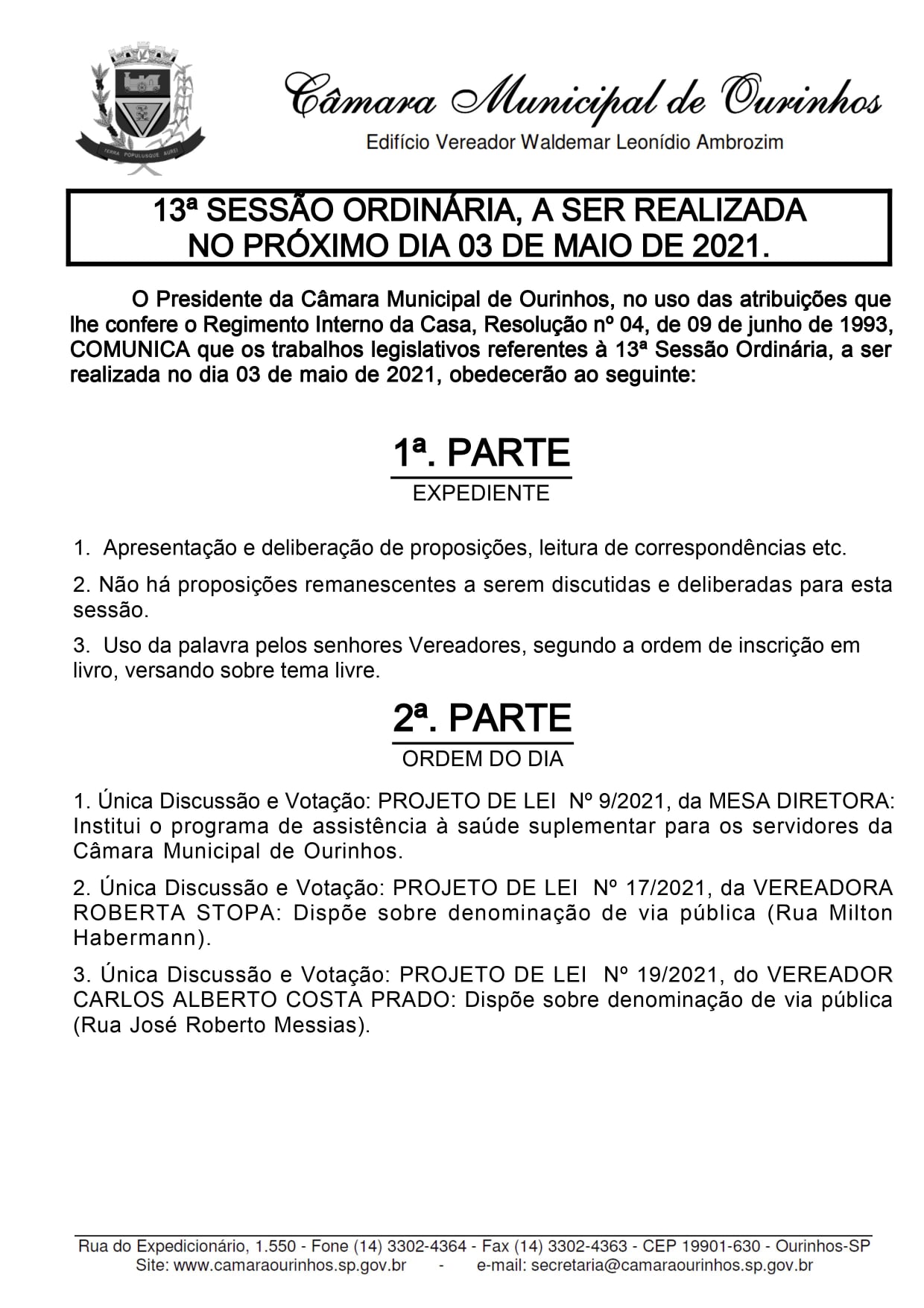Hoje, às 17 horas, acontecerá a 13ª Sessão Ordinária de 2021.