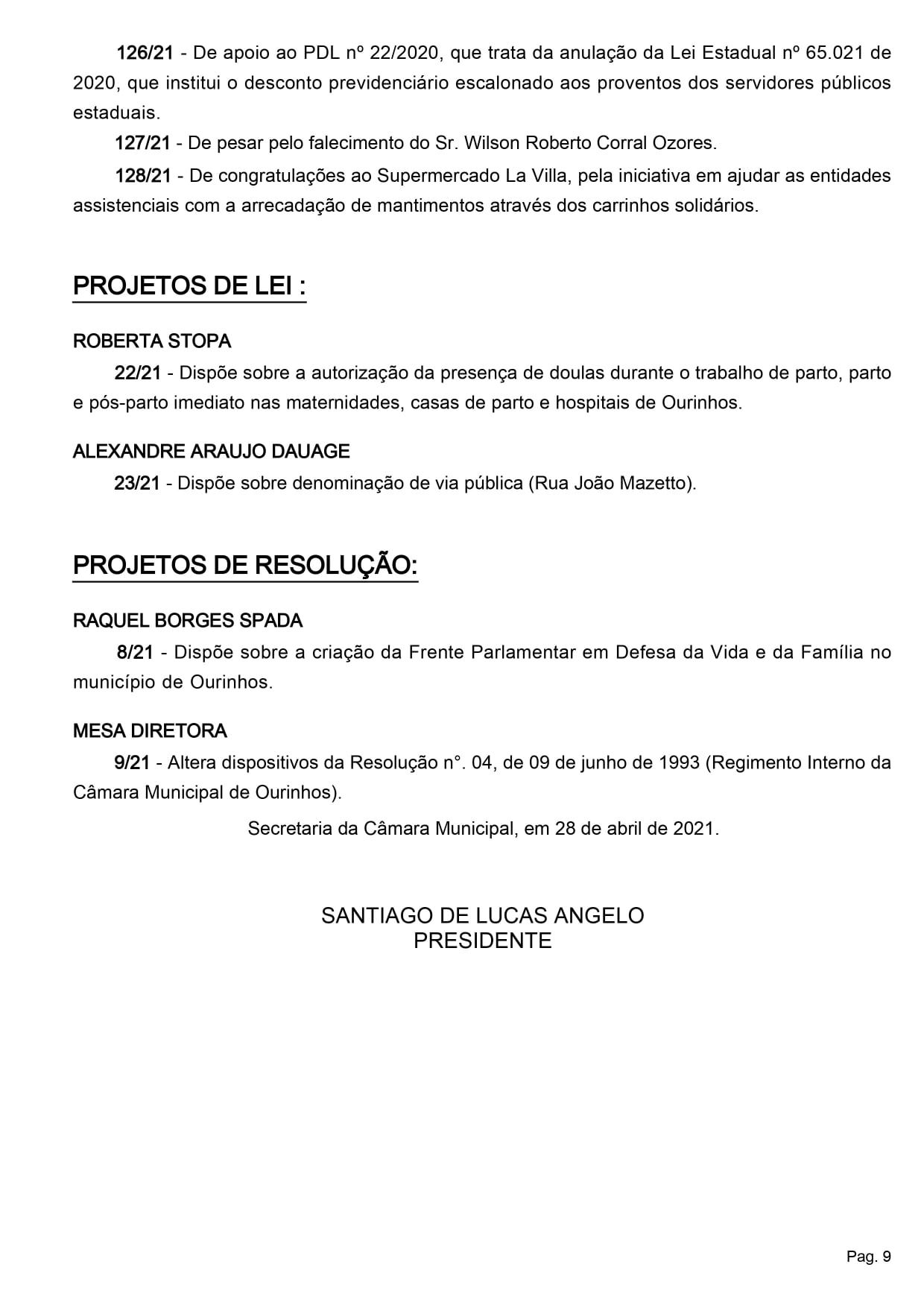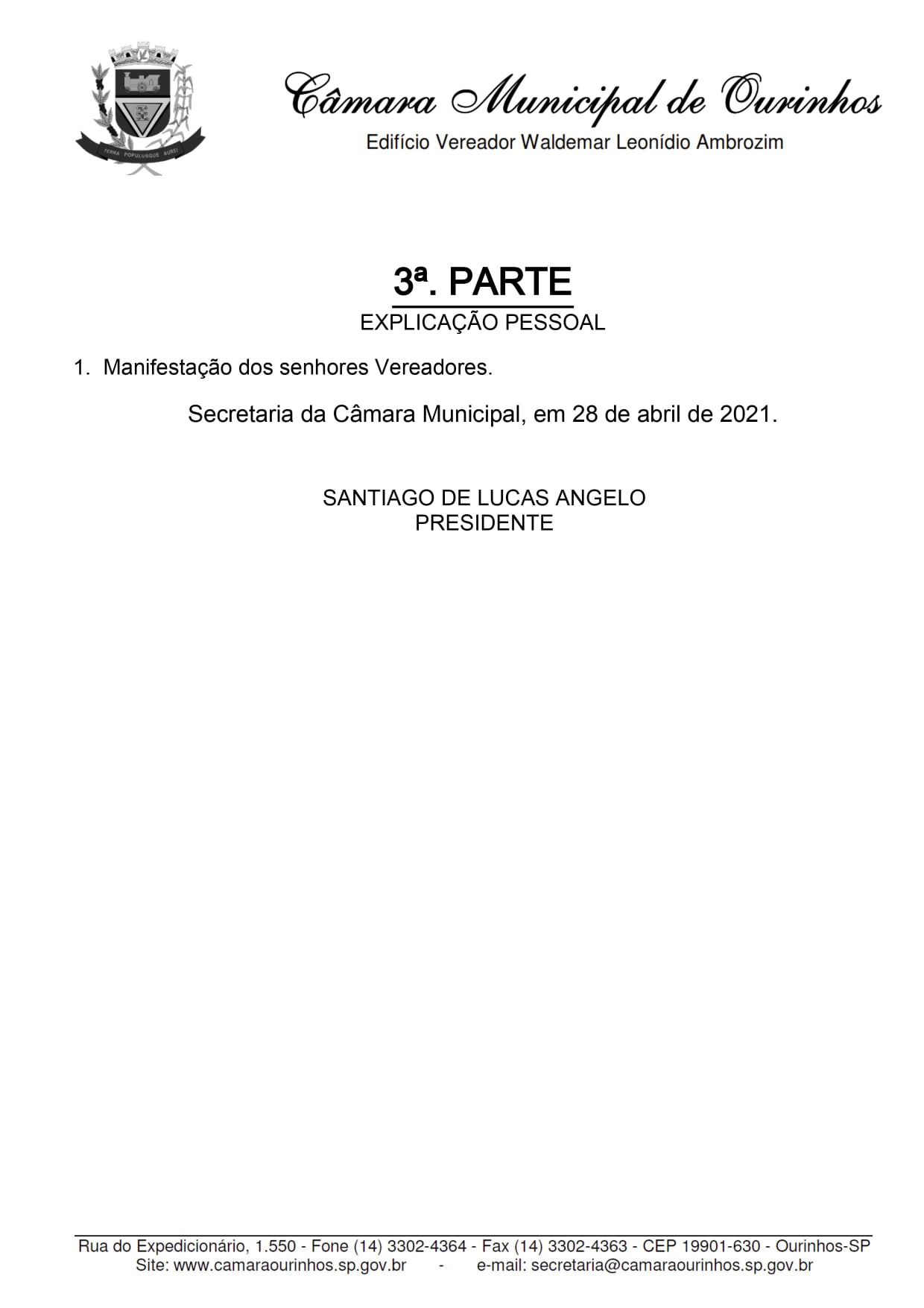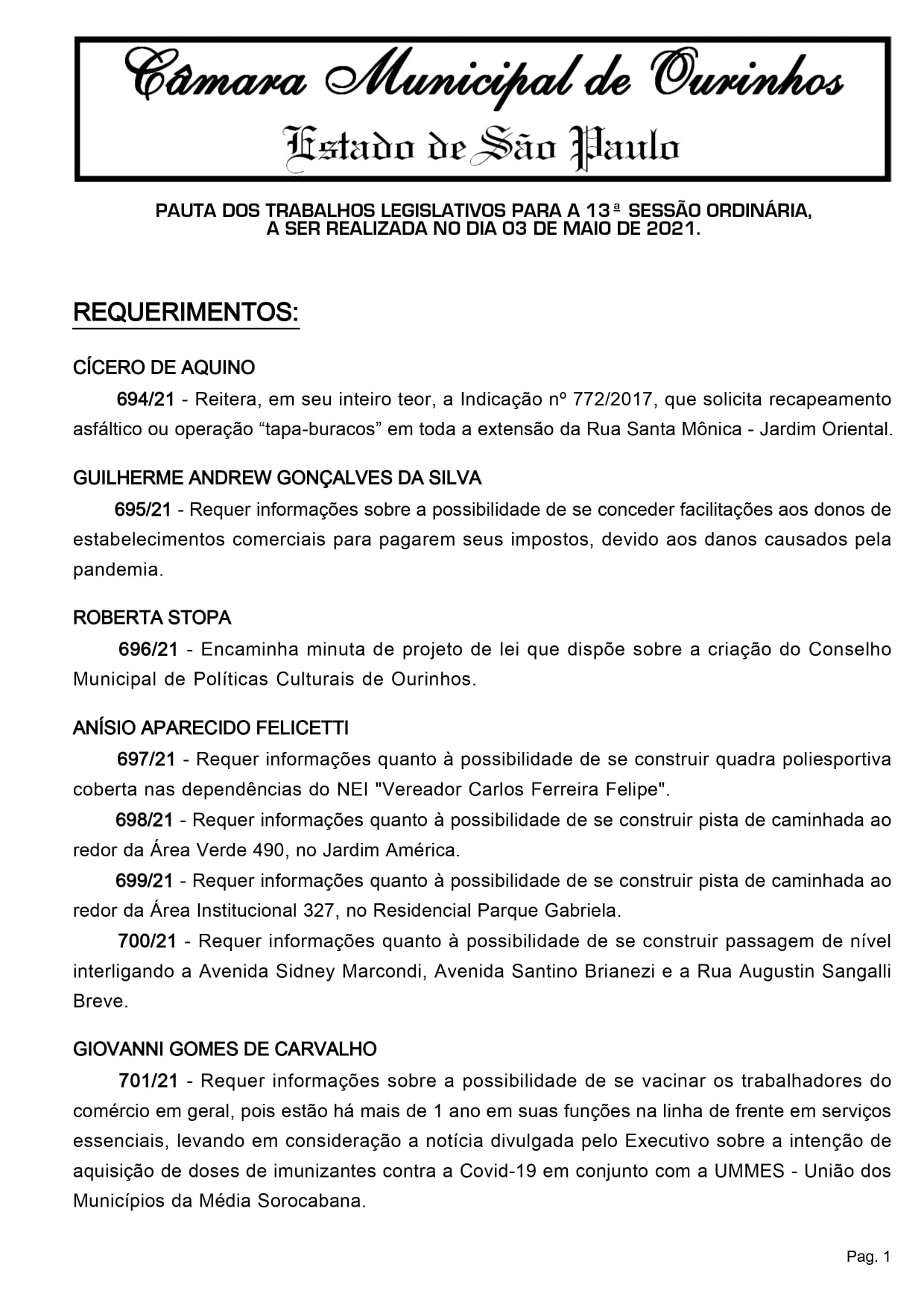Confira a pauta e acompanhe a Sessão ao vivo pelo canal 13 da Cabonnet, página do Facebook, Youtube e Instagram da Câmara Municipal de Ourinhos.