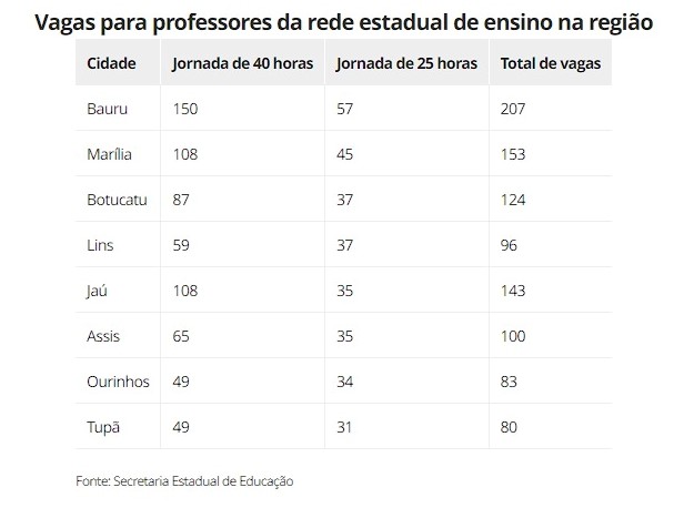 Foram prorrogadas até o dia 27 de junho as inscrições do concurso público para a contratação de 15 mil professores da rede estadual de ensino do estado de São Paulo. No centro-oeste paulista são 986 vagas destinadas a docentes em Ourinhos, Bauru, Marília, Botucatu, Jaú, Lins, Tupã e Assis (SP).