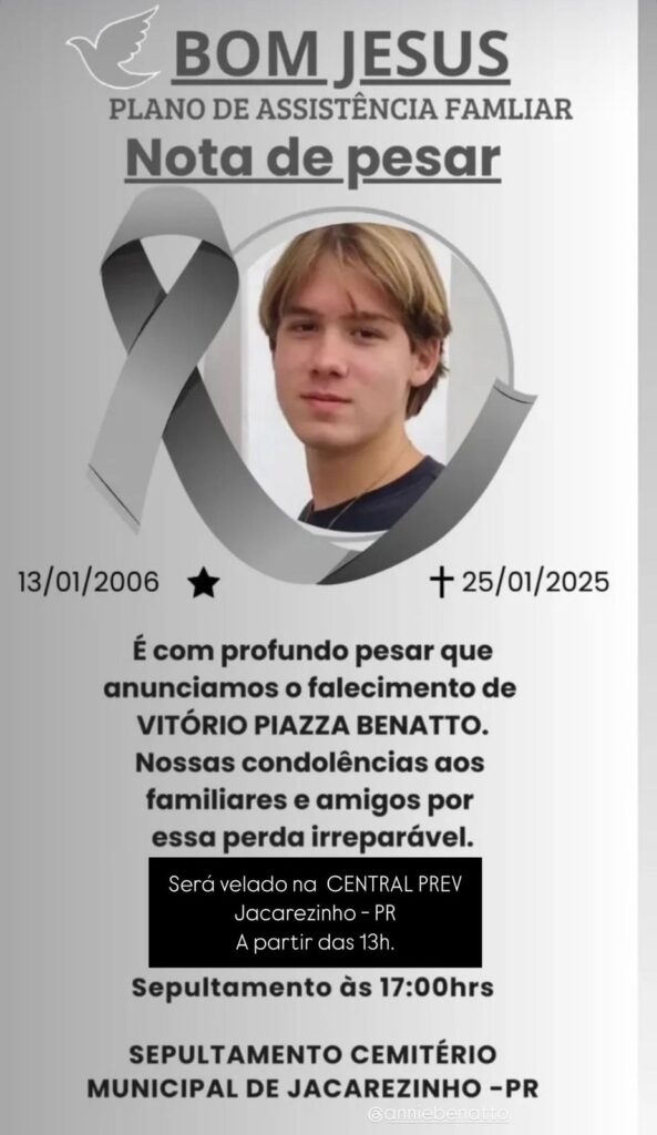 A vítima, Vitório Piazza Benatto, dirigia o veículo com uma outra jovem e se chocou contra um píer, momento em que ambos foram arremessados na água.