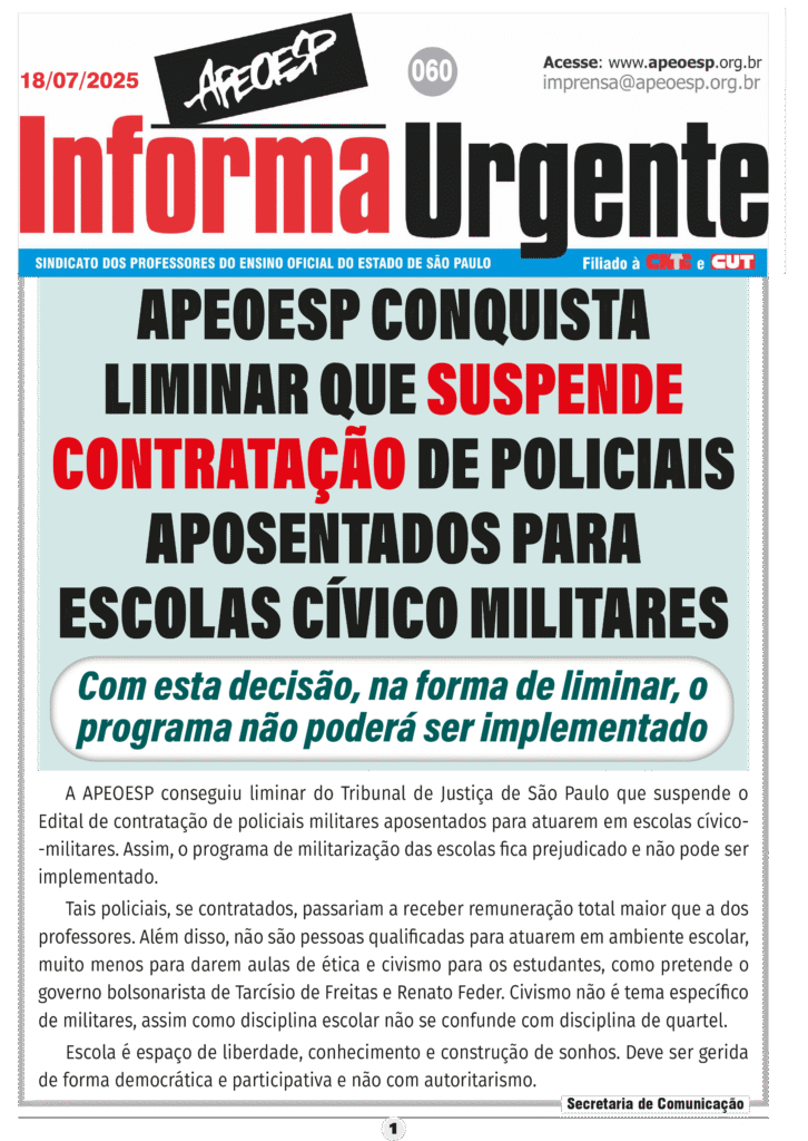 Na sexta-feira, 18 de julho, o Tribunal de Justiça do Estado de São Paulo considerou inconstitucional o edital da Secretaria da Educação que previa a contratação de policiais militares da reserva para atuar como monitores em escolas cívico-militares no estado.