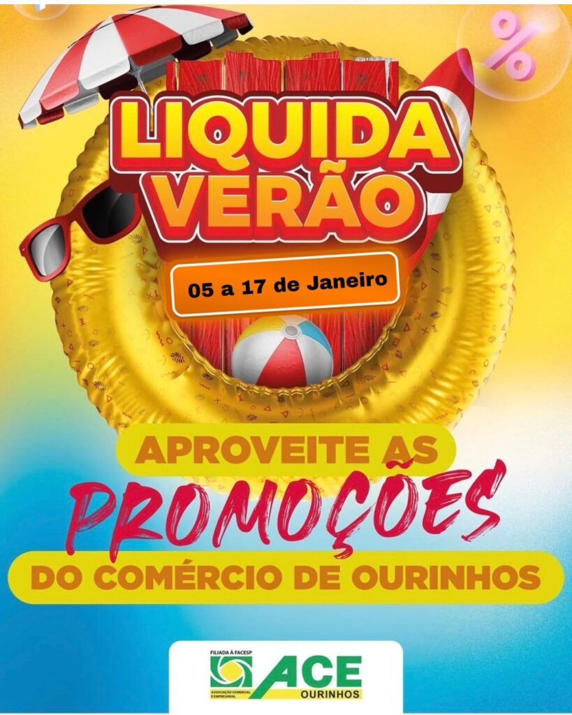Entre os dias 5 e 17 de janeiro, o comércio de Ourinhos realiza o Líquida Verão, reunindo lojas de diversos segmentos com descontos especiais, ofertas imperdíveis e condições facilitadas para os consumidores.