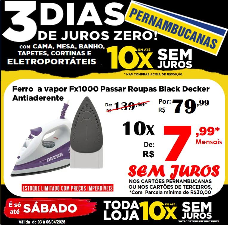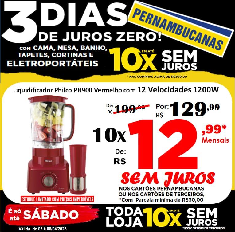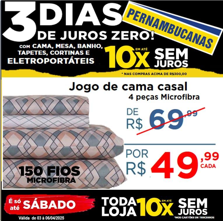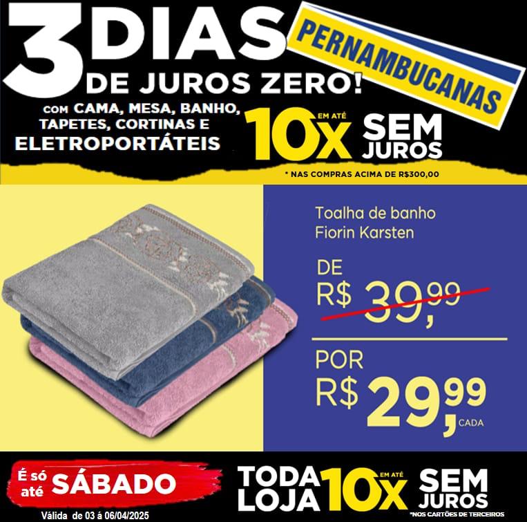 Começou nas Lojas Pernambucanas de Ourinhos e vai até o Sábado, dia 05, a Mega Promoção 3 dias de JURO ZERO com os produtos mais queridos dos consumidores: cama, mesa, banho, cortinas, tapetes e eletroportáteis. Só que tem a tradição de 115 anos, traz produtos especiais e preços imperdíveis.