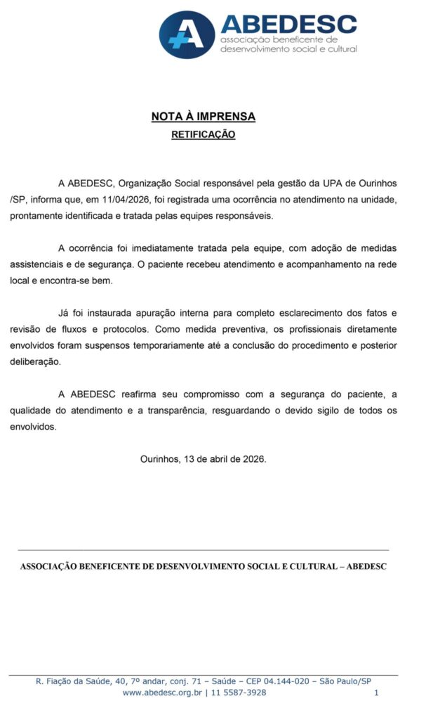 Em nota oficial, a ABEDESC, organização social responsável pela gestão da UPA de Ourinhos, disse que a ocorrência foi identificada e prontamente tratada pelas equipes, sendo adotadas medidas assistenciais imediatas, oferecido o devido acompanhamento ao paciente na rede de saúde, e que a criança passa bem.