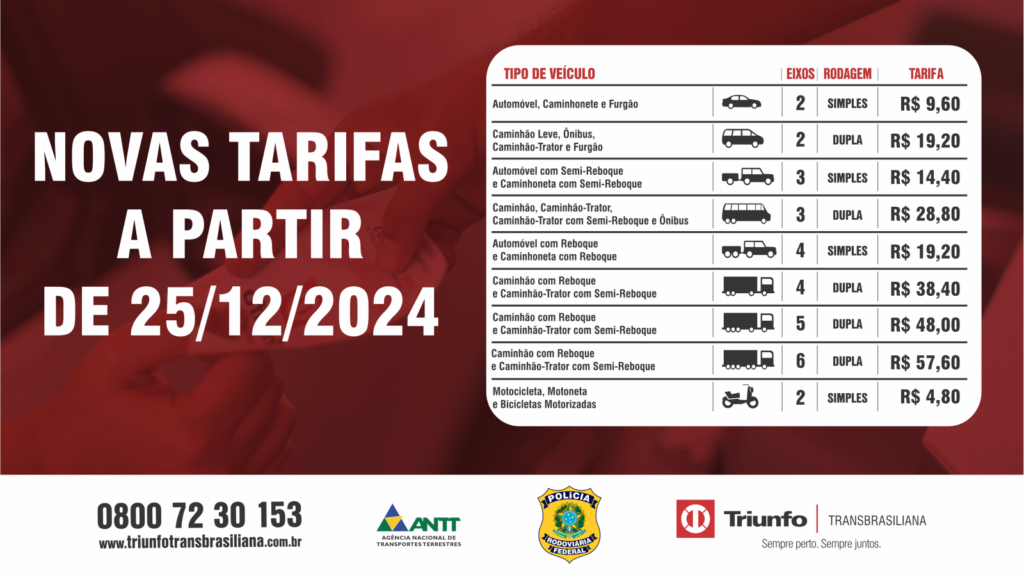 Quem for trafegar pela Rodovia Transbrasiliana (BR-153) pagará mais caro pelo pedágio à partir da 0h00 deste feriado de natal (25/12). As praças de Marília, Lins, José Bonifácio e Onda Verde, que estão no trecho paulista da rodovia, terão reajuste de 4,68% nas tarifas.
