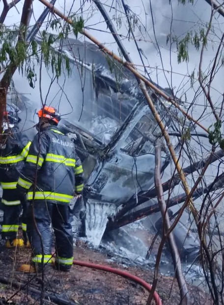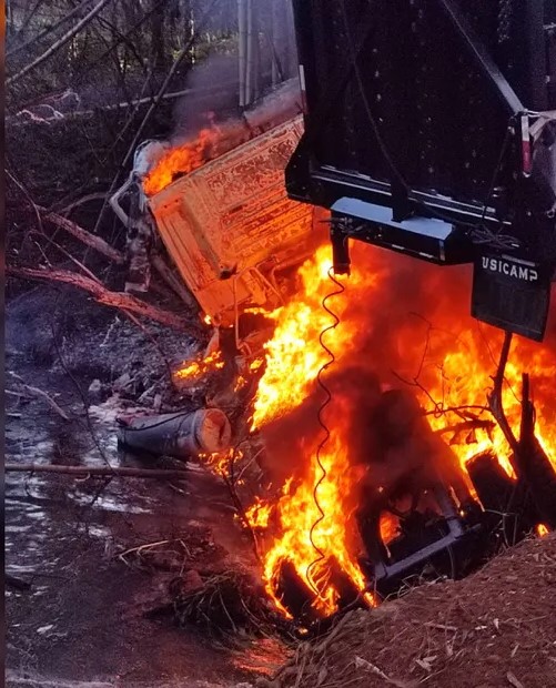 O motorista do veículo foi encontrado carbonizado no banco de trás do caminhão. O corpo foi encaminhado ao IML e a polícia apura as causas do acidente.