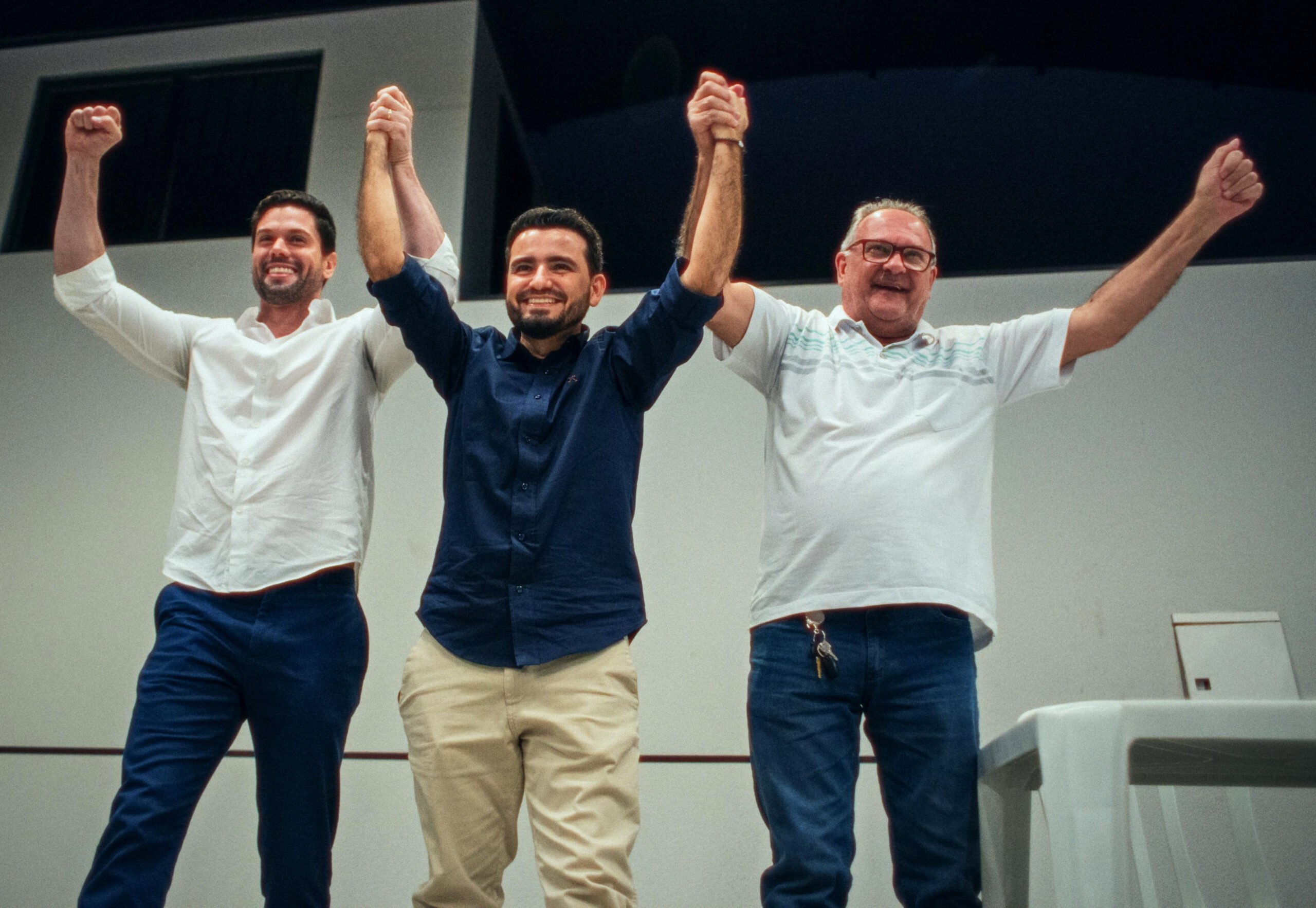 Caio Lima (ao centro) e Dr. Ferreirinha (à direita) têm o apoio do atual prefeito Lucas Pocay (à esquerda)