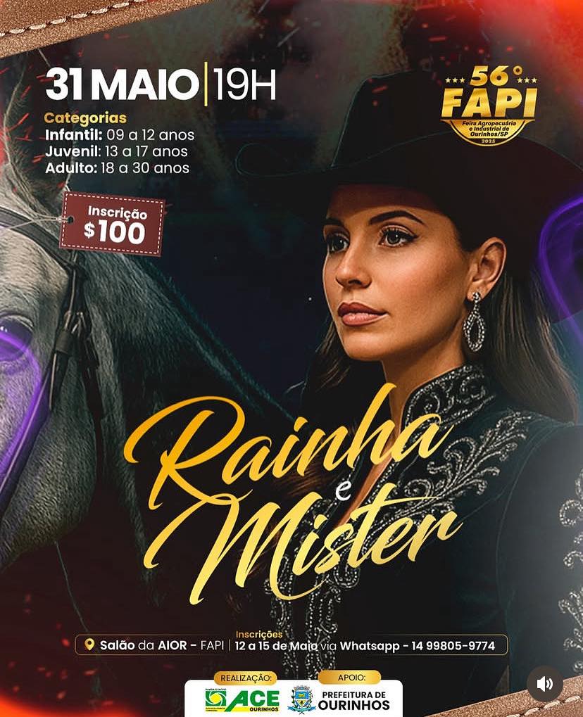 CONCURSO RAINHA & MISTER FAPI 2025 – As inscrições para o tradicional concurso já estão abertas desde o dia 11 e se encerram no dia 31 de maio, quando acontece às 19h, no salão da AIOR também instalado no recinto Olavo Ferreira de Sá, a escolha dos representantes desta edição.