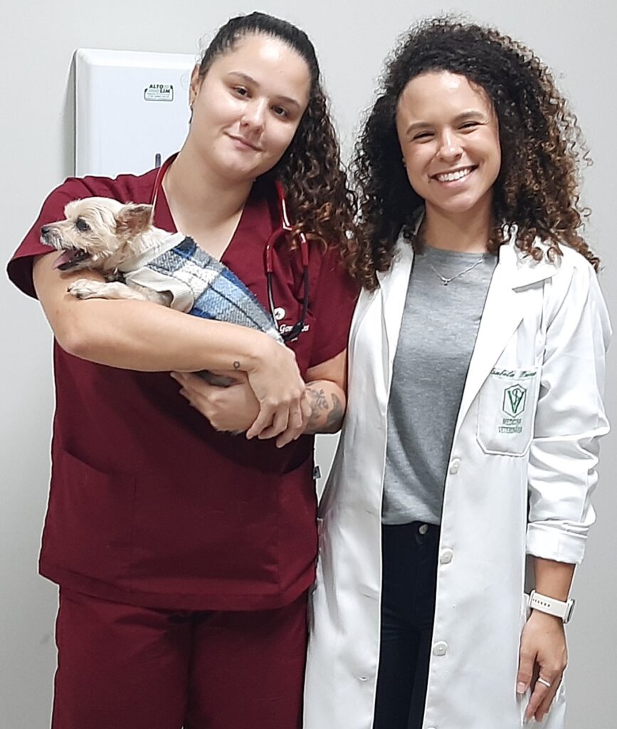 Bárbara, médica veterinária formada na Faculdade Federal do Paraná e hoje residente no hospital do UNIFIO na área de anestesiologia e Isabela Mariano, professora de anestesiologia da universidade