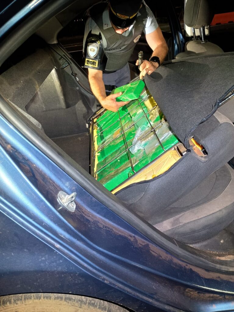 Durante a vistoria, localizaram no parachoque traseiro, laterais do porta-malas e portas, grande quantidade de tabletes de maconha.