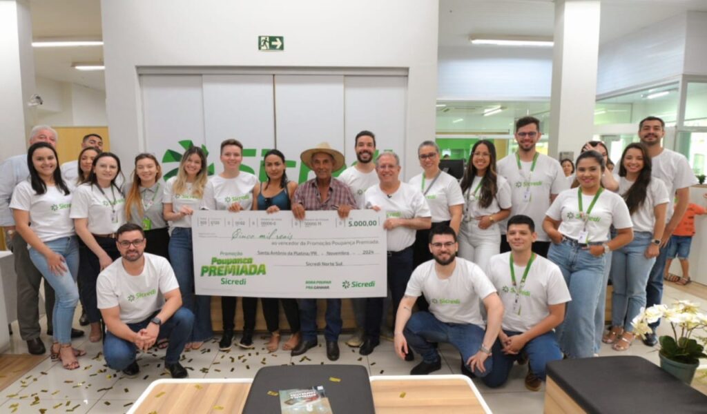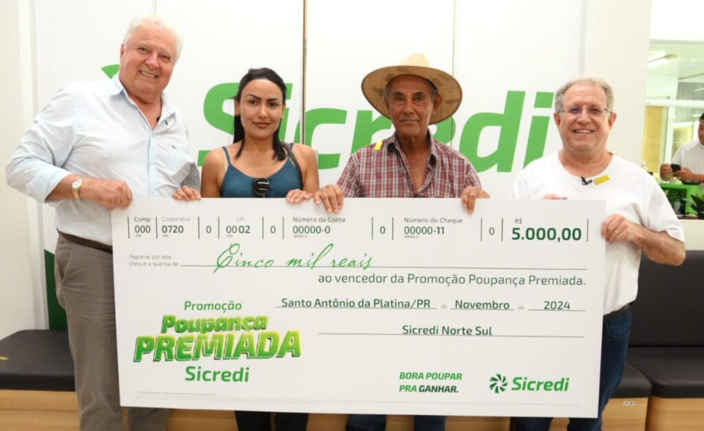 Estrelada pela cantora Ana Castela, a Promoção Poupança Premiada do Sicredi segue fazendo ganhadores na região. Desta vez o poupador da Sicredi Norte Sul, Pedro Dimas da agência de Santo Antônio da Platina foi contemplado no sorteio semanal e levou um dos prêmios de R$5 mil. Ele foi surpreendido pelos colaboradores da instituição, que contaram com o apoio da filha do sorteado para realizar uma surpresa e fazer a entrega do simbólica do prêmio.