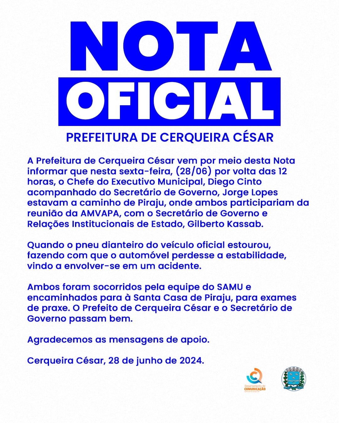 A assessoria de imprensa da Prefeitura de Cerqueira César emitiu uma Nota Oficial, onde explica que o Chefe do Executivo e o Secretário estavam a caminho de Piraju, onde participariam da reunião da AMVAPA, com o Secretário de Governo e Relações Institucionais de Estado, Gilberto Kassab.