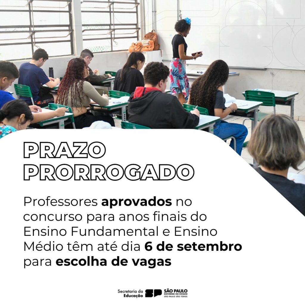 Professores selecionados para preencher as 15 mil vagas do concurso público destinado aos anos finais do Ensino Fundamental e Ensino Médio, realizado em 2023, poderão escolher as vagas desejadas até dia 6 de setembro.