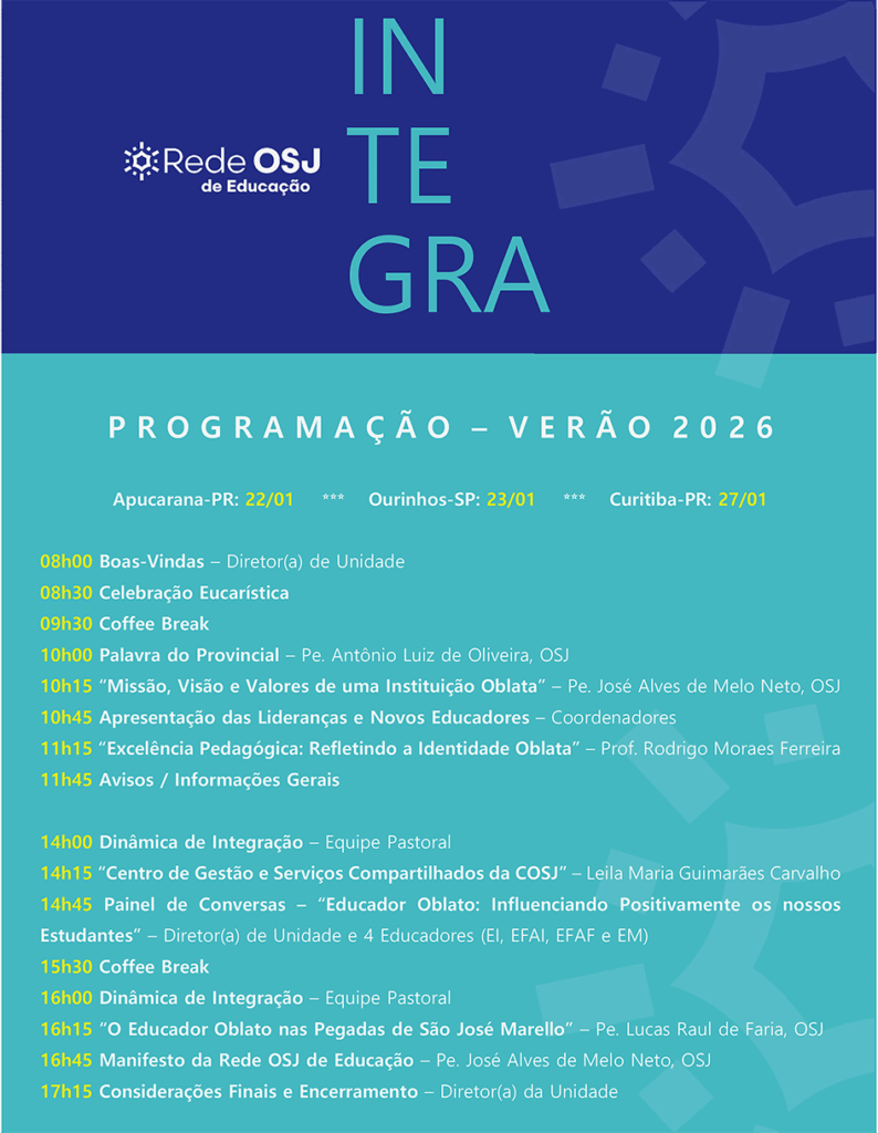 A Rede OSJ – Oblatos de São José, mantenedora do Colégio Bagozzi de Ourinhos, Apucarana e Curitiba, está promovendo nessa semana o Integra. O objetivo é dar o ‘pontapé inicial’ às atividades desse ano em todas as unidades.