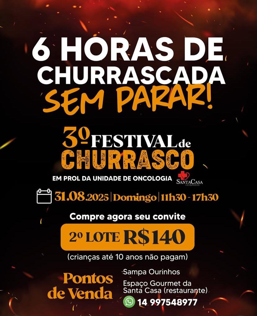 No dia 31 de agosto, a Santa Casa de Ourinhos promove a terceira edição do seu já tradicional Festival de Churrasco. O evento acontecerá das 11h30 às 17h30, na Arena Golden (próximo à APAE Rural), e promete ser a maior e melhor churrascada de Ourinhos e região.