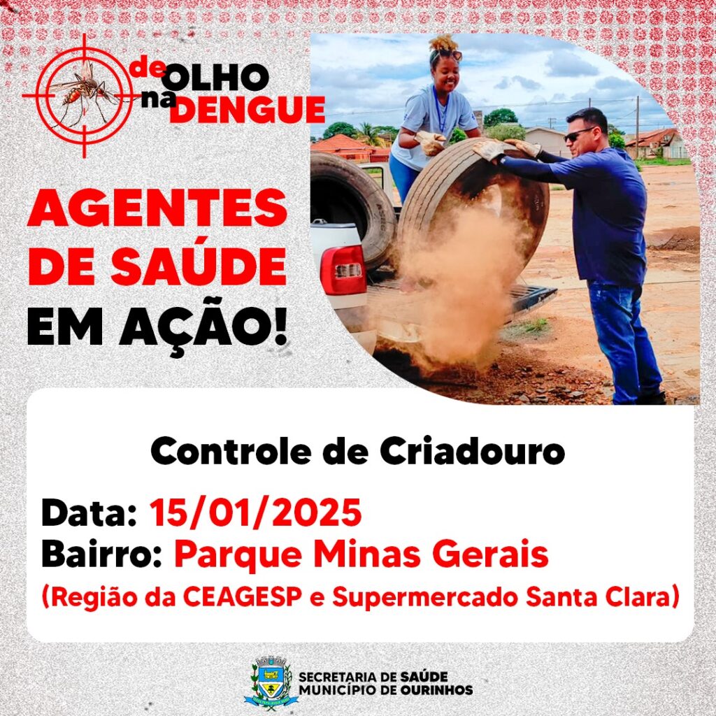 No dia 15 de janeiro, a Prefeitura de Ourinhos por meio da Secretaria Municipal de Saúde, realizará uma ação de combate ao mosquito Aedes aegypti, transmissor da dengue, zika e chikungunya, no Bairro Parque Minas Gerais, abrangendo a região da CEAGESP e as proximidades do Supermercado Santa Clara.