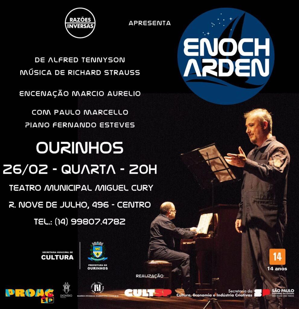 A Prefeitura Municipal de Ourinhos, por meio da Secretaria de Cultura, traz o primeiro espetáculo do ano ao Teatro Municipal. A Companhia Razões Inversas apresenta Enoch Arden, um espetáculo emocionante que une teatro e música em uma narrativa de amor, sacrifício e destino. Com direção de Marcio Aurelio, texto de Alfred Tennyson e música de Richard Strauss, a montagem traz à cena um dos mais belos e comoventes melodramas já escritos.