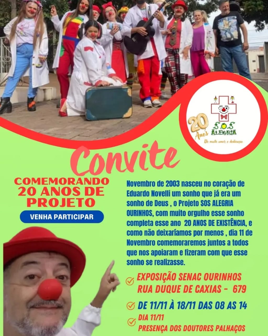 Para comemorar essas duas décadas de realizações, o SOS Alegria preparou uma exposição multimídia, que ocorrerá de 11 a 18 de novembro no Senac de Ourinhos. Neste evento, os “doutores palhaços”, como são carinhosamente chamados os voluntários, compartilharão um pouco da história e do impacto positivo que o grupo teve na comunidade ao longo dos anos. Será uma oportunidade de celebrar esses heróis anônimos que roubam sorrisos, espalham amor e esperança para a recuperação física e emocional daqueles que mais precisam.
