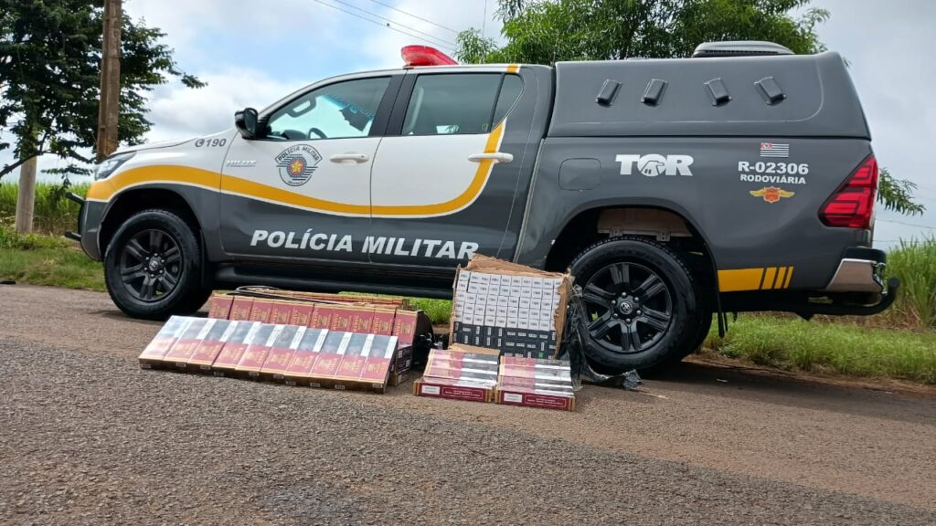 Policiais do Tático Ostensivo Rodoviários apreendem mais de 1500 maços de cigarros e essências líquidas para cigarros eletrônicos com passageiro de ônibus regular em Ourinhos, na Rodovia Orlando Qagliato, Km 28 + 400m.