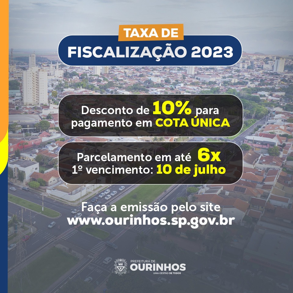 A Prefeitura de Ourinhos, por meio da Secretaria Municipal de Finanças, notifica os contribuintes de atividades de comércio, indústria, agropecuária, serviços, associações em geral e demais grupos inclusos que já estão disponíveis os carnês do exercício 2023 das Taxas de Fiscalização (de Estabelecimentos; de Publicidade; para Ocupação de solo nas Vias e Logradouros Públicos; para o Comércio Ambulante).