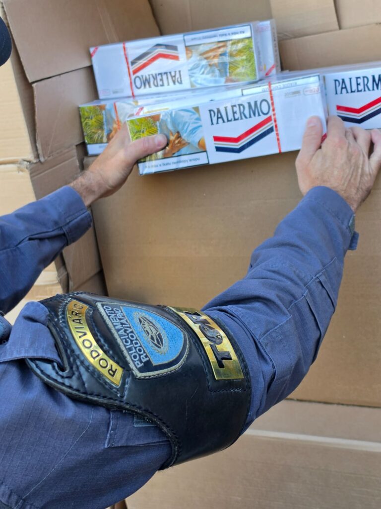 A equipe, ao abrir o compartimento de carga, deparou-se com uma grande quantidade de cigarros da marca Palermo.