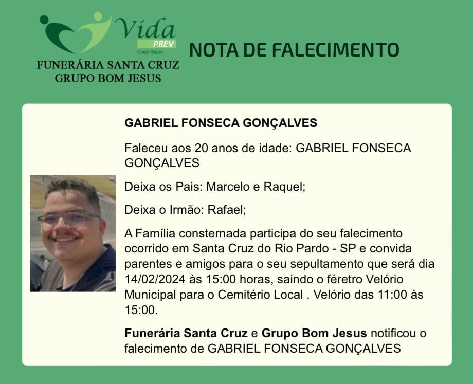 O jovem Gabriel Fonseca está sendo velado no Velório Municipal, com sepultamento marcado para as 15h no cemitério de Santa Cruz do Rio Pardo.