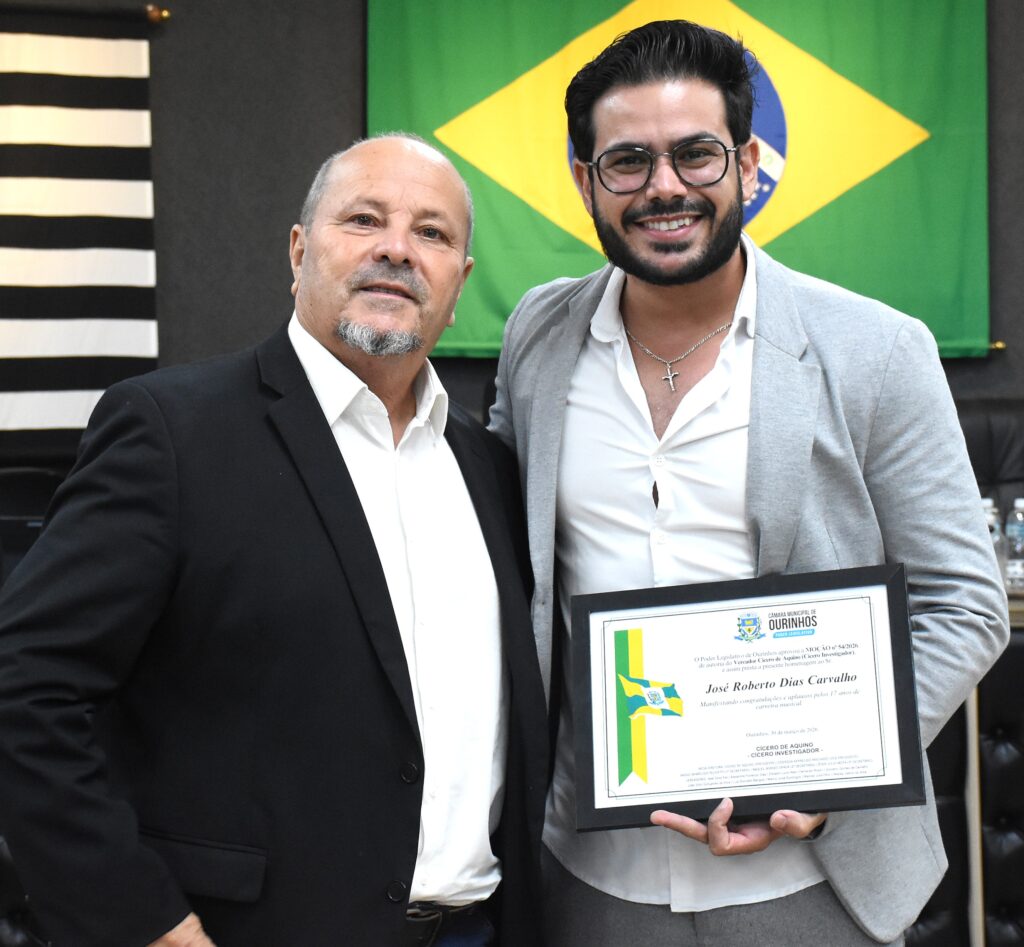 O presidente da Câmara Municipal de Ourinhos, vereado Cícero Investigador, entregou na sessão de 06/04, uma Moção de Congratulações e Aplausos ao cantor ourinhense Zé Roberto pelos seus 17 anos de carreira musical.