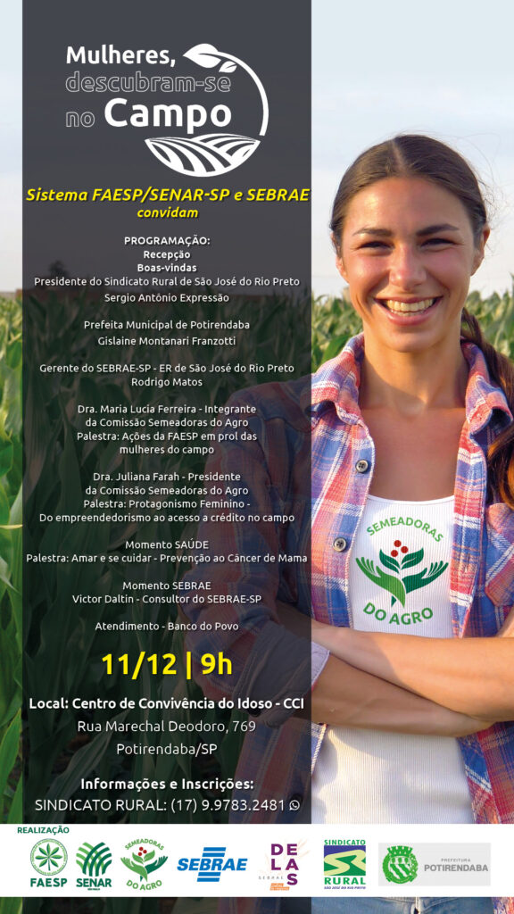 A iniciativa “Mulheres, Descubram-se no Campo” da Comissão Semeadoras do Agro, da Federação da Agricultura e Pecuária do Estado de São Paulo (Faesp), em parceria com o Sebrae-SP, chega a mais um município paulista nesta quinta-feira (11/12). Desta vez, Potirendaba receberá o projeto que leva a produtoras rurais empoderamento, estímulo ao empreendedorismo e troca de experiências.