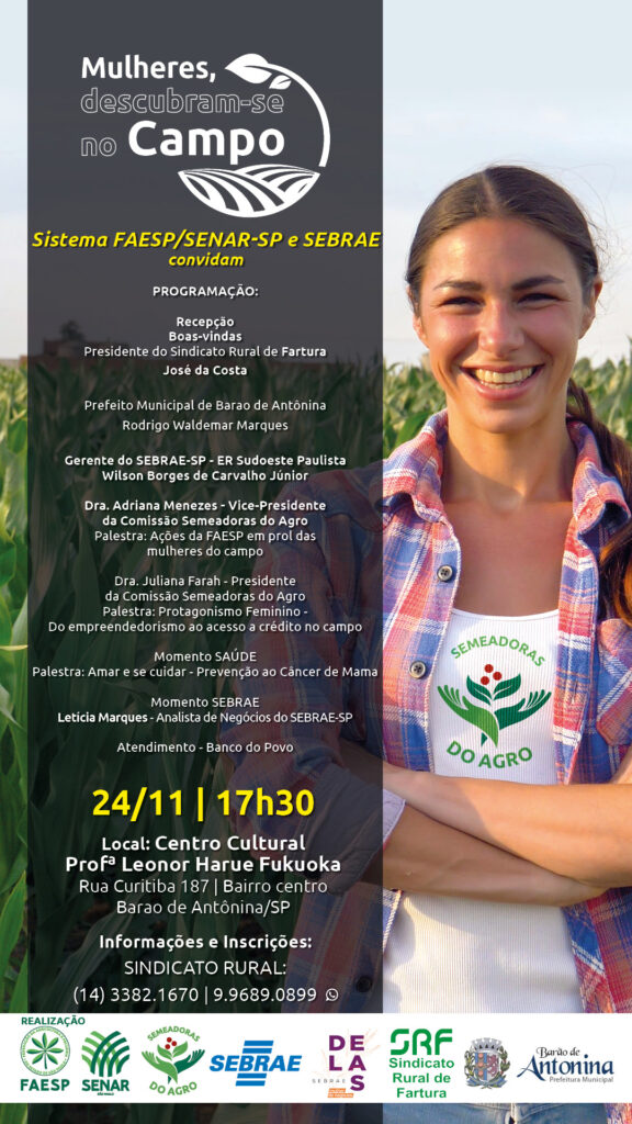 A iniciativa “Mulheres, Descubram-se no Campo” da Comissão Semeadoras do Agro, da Federação da Agricultura e Pecuária do Estado de São Paulo (Faesp), em parceria com o Sebrae-SP, chega a mais um município paulista nesta segunda-feira (24/11). Desta vez, Barão de Antonina receberá o projeto que leva a produtoras rurais empoderamento, estímulo ao empreendedorismo e troca de experiências.