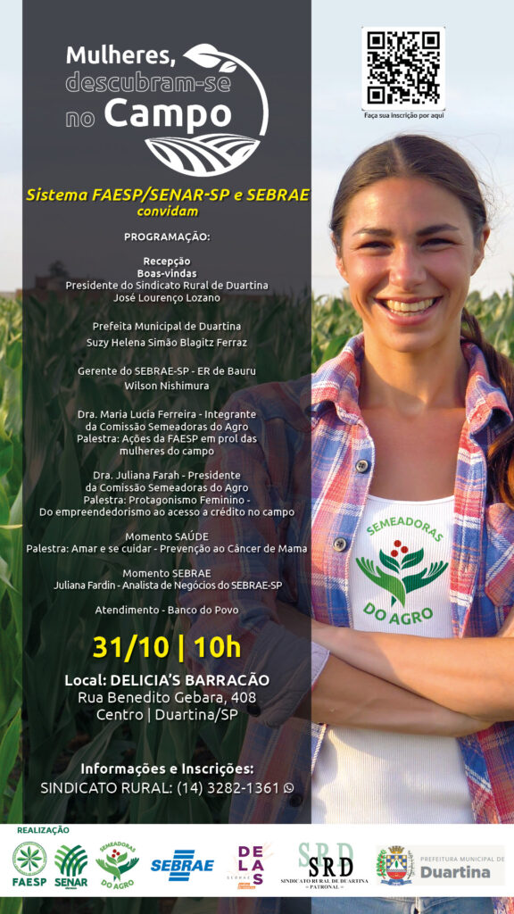 A iniciativa “Mulheres, Descubram-se no Campo” da Comissão Semeadoras do Agro, da Federação da Agricultura e Pecuária do Estado de São Paulo (Faesp), em parceria com o Sebrae-SP, chega a mais um município paulista nesta sexta-feira (31/10). Desta vez, Duartina receberá o projeto que leva a produtoras rurais empoderamento, estímulo ao empreendedorismo e troca de experiências.
