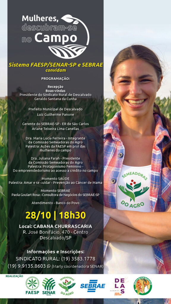 A iniciativa “Mulheres, Descubram-se no Campo” da Comissão Semeadoras do Agro, da Federação da Agricultura e Pecuária do Estado de São Paulo (Faesp), em parceria com o Sebrae-SP, chega a mais um município paulista nesta terça-feira (28/10). Desta vez, Descalvado receberá o projeto que leva a produtoras rurais empoderamento, estímulo ao empreendedorismo e troca de experiências.